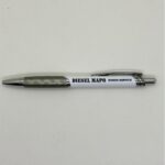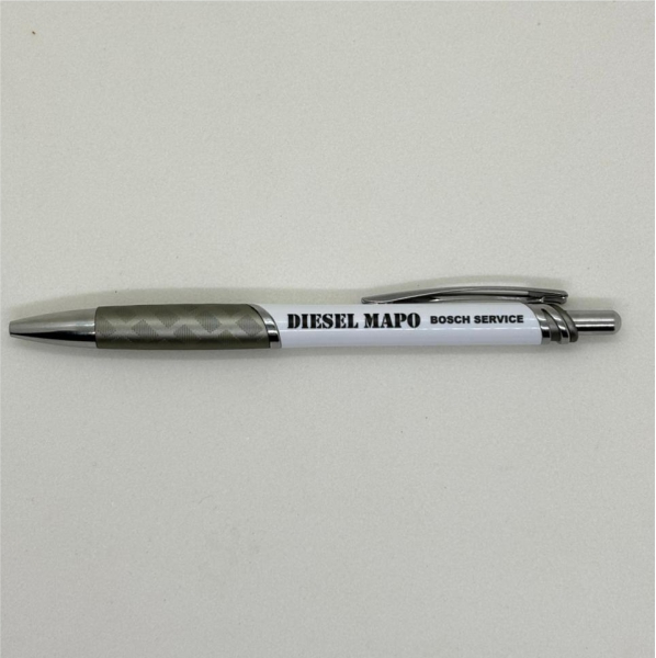 Cuerpo blanco con grip de goma color con efecto frost y trama antideslizante. El botón y puntera ) es de plástico plateado mate. Posee un clip de metal con detalles de color. Tinta negra