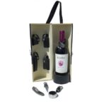 Contiene 4 piezas, destapador con cortante, tapón, aro corta gotas y pico vertedor. Hecho en eco cuero. NO incluye botella de vino.