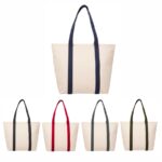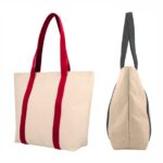 De 100% algodón con forro de Lienzo Crudo. Cierre con broche Imán. Manijas de cinta de diferentes colores, tejida 100% algodón de 30 mm. Medidas : 46 x 38 x 13 cm