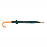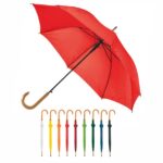 Con mecanismo de apertura automático. De poliéster 190T. Puntera y mango curvo de madera. 8 Gajos.