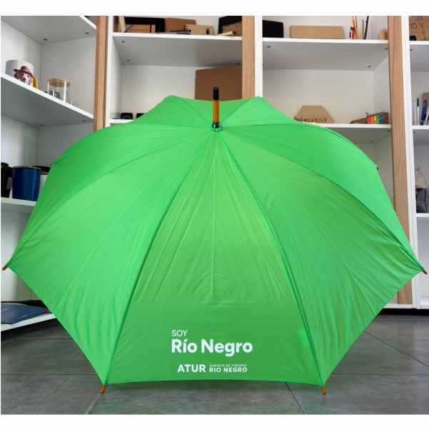 Con mecanismo de apertura automático. De poliéster 190T. Puntera y mango curvo de madera. 8 Gajos.