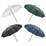 De 8 gajos, fabricado en rPet (Pet reciclado). Con mango de madera, y estructura y puntera metálicas. Con mecanismo de apertura automática.
