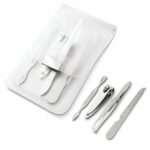 Contiene 4 piezas de Metal: alicate, lima de uñas, repujador de cutículas y pinza de depilar, en bolsa de PVC.