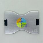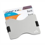 De aluminio con acabado mate. Cuenta con bloqueo RFID y correa elástica de poliéster. Con capacidad para varias tarjetas.