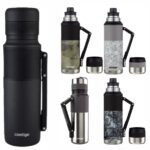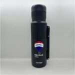 En acero inoxidable 304 de doble pared insulado, con aislamiento de vacío. Libre de BPA, Con pared con protección de silicona. Boquilla 360° para servir desde cualquier ángulo, pico vertedor a prueba de derrames y fugas. Apertura total en solo un 1/4 de vuelta. Mantiene la temperatura durante 35 hs caliente y 60 hs frío. Agarre de silicona Tapa funciona como vaso de 236 ml