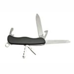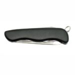 Cuenta con 6 funciones: cuchilla, lima, destapador, saca corcho, enhebrador de agujas y destornillador plano.