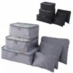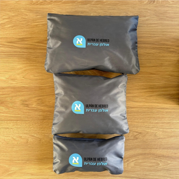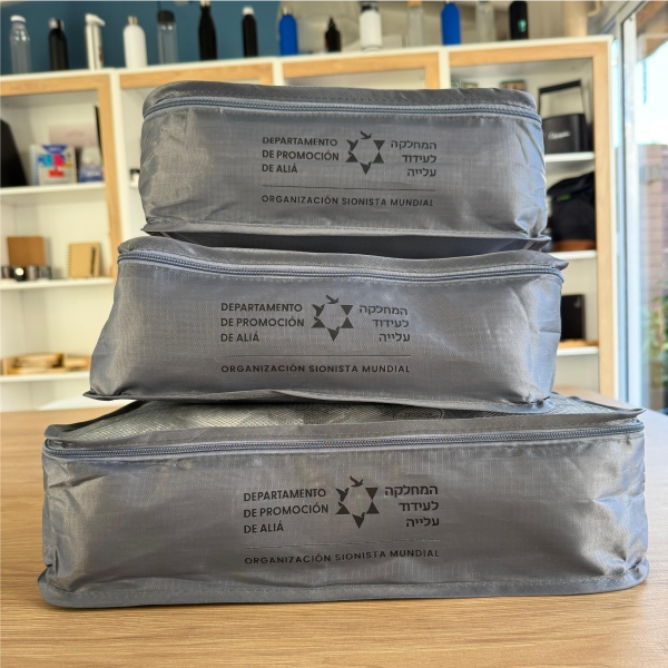 Compuesto por 3 organizadores de tela y red con doble cierre y 3 bolsas de tela con cierre individual.
