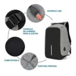 Premium con USB, reforzada. Material impermeable, cierre principal de seguridad oculto en el espaldar. Porta notebook hasta 15.6