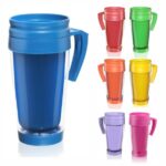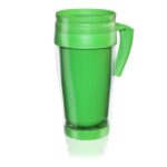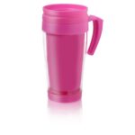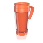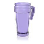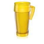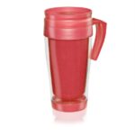Cuerpo cristal con tapa, asa, e interior en colores vibrantes. Tapa vertedora, con cierre para mantener la temperatura de la bebida, fría o caliente. Consulte por colores especiales.
