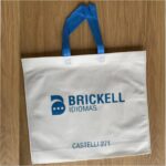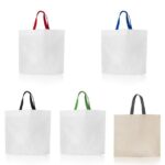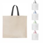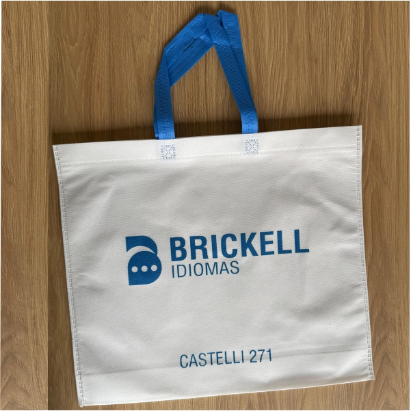 En tela no tejida (Friselina) de 70grs, termo selladas por ultrasonido. Manijas que soportan hasta 24 kilos. 100% reciclables.