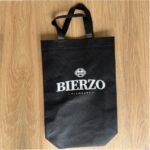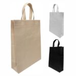Con manijas y fuelle. Fabricada en tela no tejida (Friselina) de 90g, termo sellada por ultrasonido. 100% reciclables. Manijas que soportan hasta 24 kilos.
