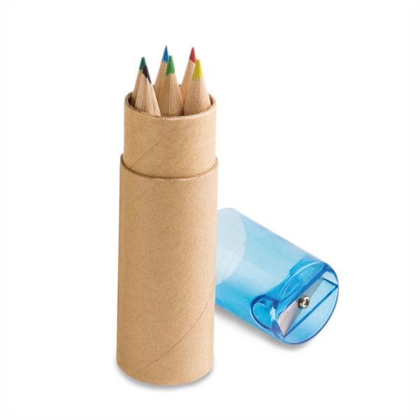 Caja de cartón cilíndrica com 6 lápices de colores cortos de madera. Con sacapuntas incorporado en la tapa.