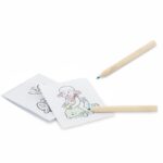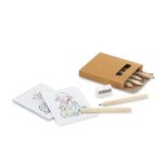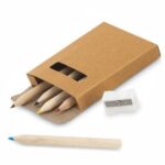 En caja que incluye 6 lápices de colores cortos, 1 sacapuntas y 15 tarjetas con dibujos para colorear.