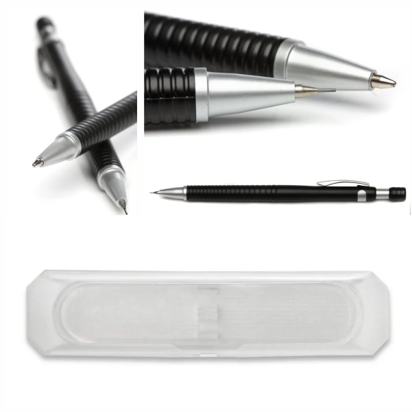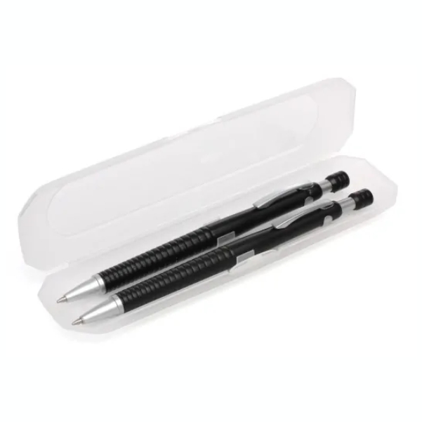 Bolígrafo retráctil y lápiz mecánico con mina de grafito. Ambos con cuerpo plástico negro, clip y punta gris metalizada.