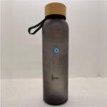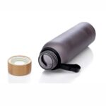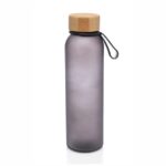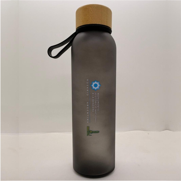 De vidrio borosilicato, esmerilado, reutilizable. Con tapa de Bambú. Agarre de goma siliconada color negro. Producto aprobado por el I.N.A.L.