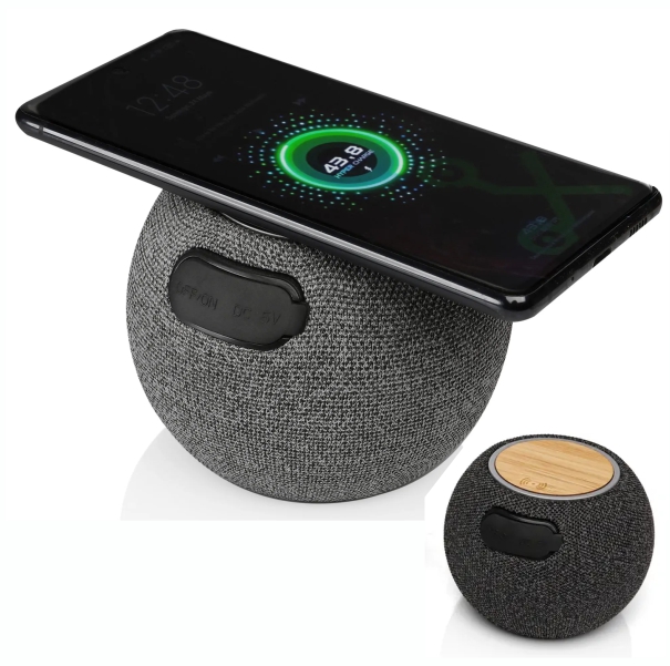 Parlante Bluetooth Alcance: 10 mts y Potencia: 5 W.. Batería: 1200 mAh. Carcasa fabricada en bambú y poliéster RPET*. Incluye cargador inalámbrico de 15W que admite carga rápida y cable USB.