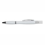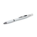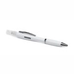 Indicador de nivel de líquido en el cuerpo del bolígrafo. Clip de metal, separador de grip y puntera metalizados. Mecanismo de apertura medio giro. Tinta negra.