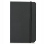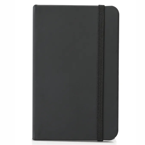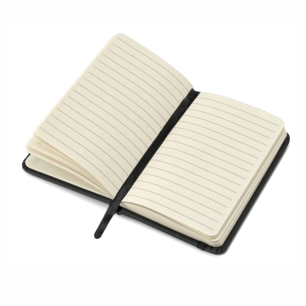 Cuaderno forrado en eco cuero soft mate con banda elástica de sujeción al tono, 80 hojas rayadas de papel crema de 70gr. y señalador y Bolígrafo touch plateado.
