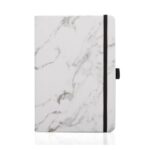 De tapa dura forrado en eco cuero soft mate diseño marmolado con banda elástica.