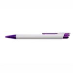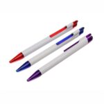 Cuerpo sólido blanco, clip y punta en color translúcido. Pulsador color translúcido combinado con plata. Tinta negra.