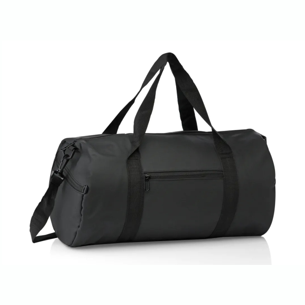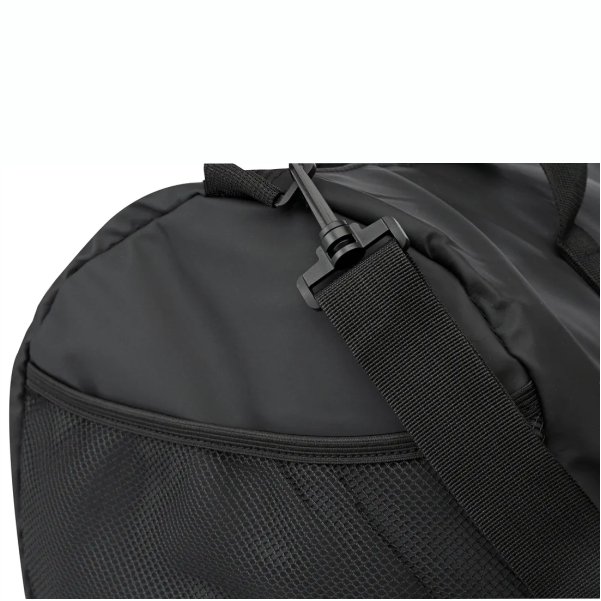 Confeccionado en cuero ecológico mate con interior en tafeta al tono, con cierre de apertura central. Un lateral con red y un lateral bolsillo con cierre. Avíos de plástico negro y correa de colgar regulable de 4 cm de ancho..