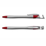 Con soporte para celular en el clip. Cuerpo metalizado plata con detalles en color.