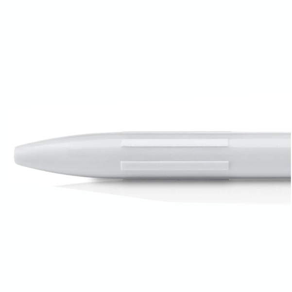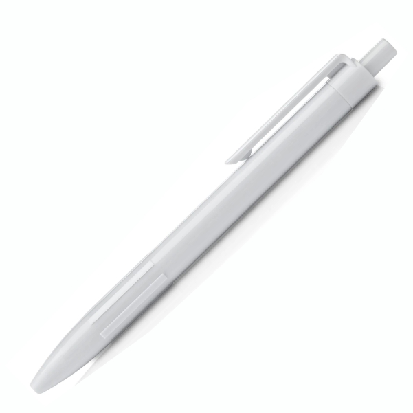 Cuerpo y clip plástico ABS reciclado blanco brillante. Con grip relieve barras. Mecanismo de apertura retráctil. Tinta negra.