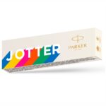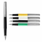 Pluma Fuente con cuerpo plástico de colores y tapa de acero inoxidable, de punta media. Tinta negra.