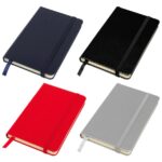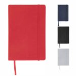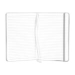 Tamaño similar a A5. 80 páginas rayadas. Separador de hojas en tela. Cierre con banda elástica. Bolsillo interior en la parte trasera de la libreta.