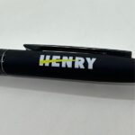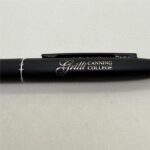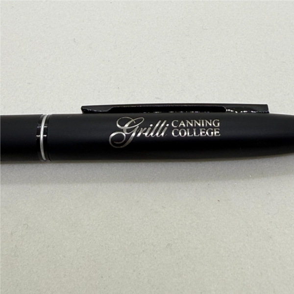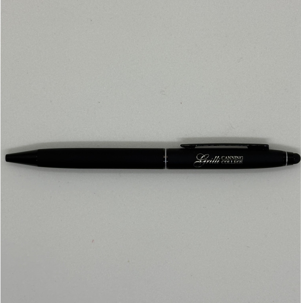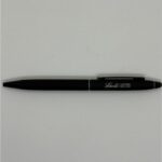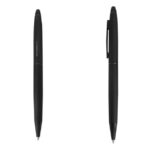 Metálico. Bolígrafo touch con apertura giratoria. Destape acero en la parte superior. Cuerpo color negro mate. Puntera, anillo y clip color negro brilloso. Tinta azul. Estuche de cartón negro.