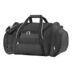 De polyester 600D. Bolso de viaje o deportivo. Bolsillo frontal y compartimentos laterales externos con cierre. Apertura superior completa con cierre. Herrajes metálicos. Correa regulable y desmontable con hombrera de goma. Manijas con velcro.