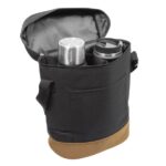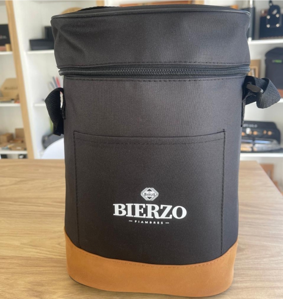 De polyester y detalles de cuero PU. Un bolsillo externo. Interior acolchonado con división para poner un termo y los accesorios que desees para un día ideal. Correa regulable.