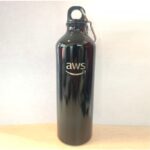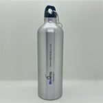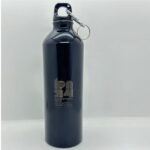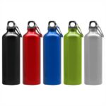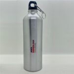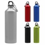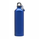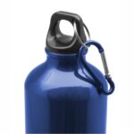 Botella de aluminio con tapa de rosca plástica y gancho metálico.