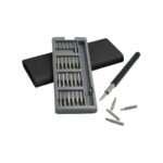 Mango con punta imantada con 24 puntas diferentes. La caja viene con cuatro compartimentos imantados que permiten mantener ordenadas las diferentes puntas. La caja contiene apertura push.