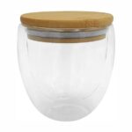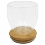 Taza de doble vidrio con tapa de bambú que puede utilizarse como posa taza/vaso. No pasa el calor. Apto para lavavajillas (únicamente la taza).