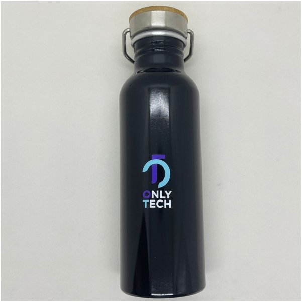 Tapa de acero con manija metálica rebatible y detalles en bambú. Anillo de silicona antiderrame. Presentación en caja de regalo.