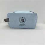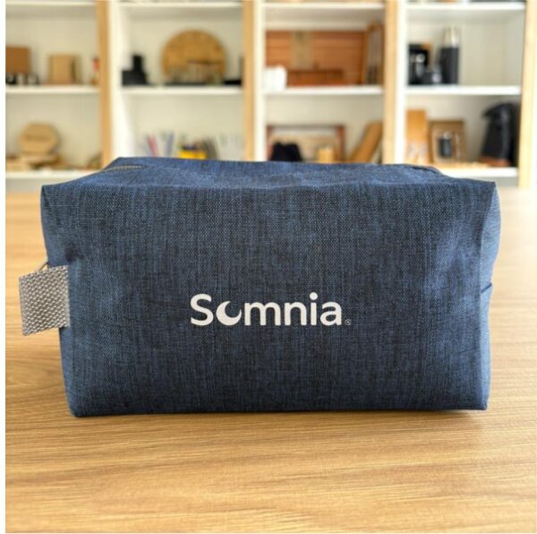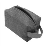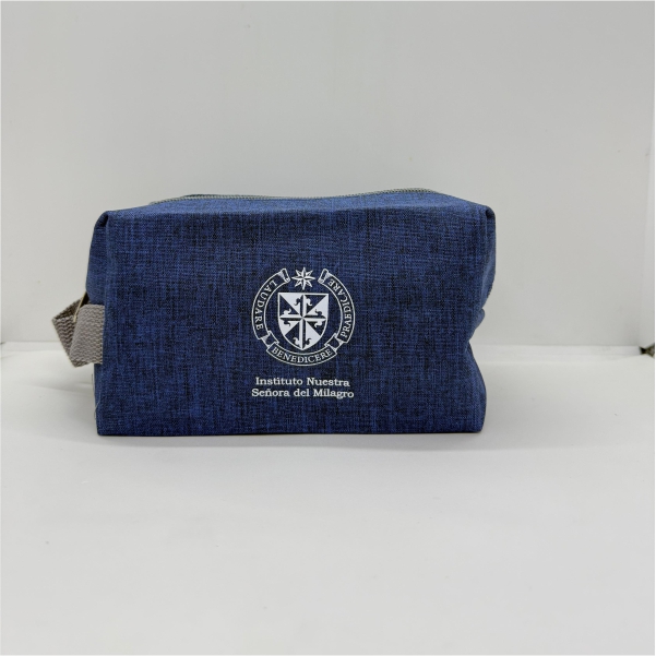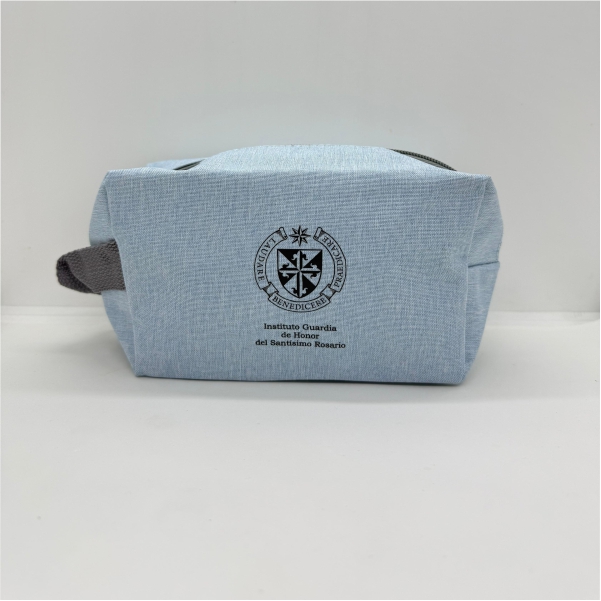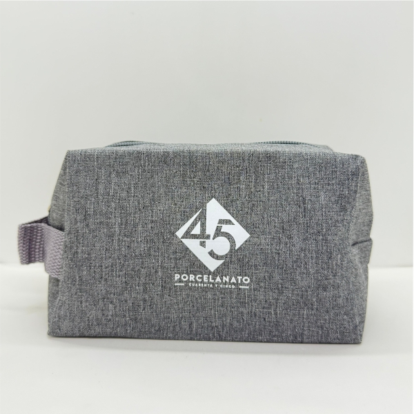 En Poliéster 300D, con amplio compartimento. Interior forrado en Poliéster 210D. Cierre con tirador metálico y asa lateral en tela de color gris.