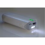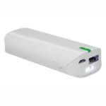 Con cargador móvil. Luz led indicadora de carga, según la carga va cambiando el color. Botón que presionando comienza la carga de un dispositivo y presionando dos veces se enciende la linterna.