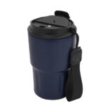 Mug doble pared, sellado al vacío, con aislamiento térmico. Tecnología vacuum. Interior en acero 304 y exterior en acero 201. Tapa de polipropileno con anillo de silicona y correa de poliéster en color negro. Pintura acabado mate. Mantiene por más de 12 hs la temperatura de las bebidas calientes y 24 hs de las bebidas frías.