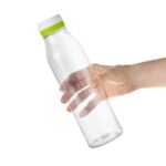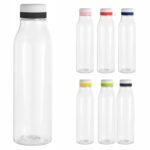 Botella de plástico transparente, pet cristalino, con tapa a rosca color blanco mate con anillo de silicona de diferentes colores.