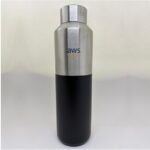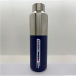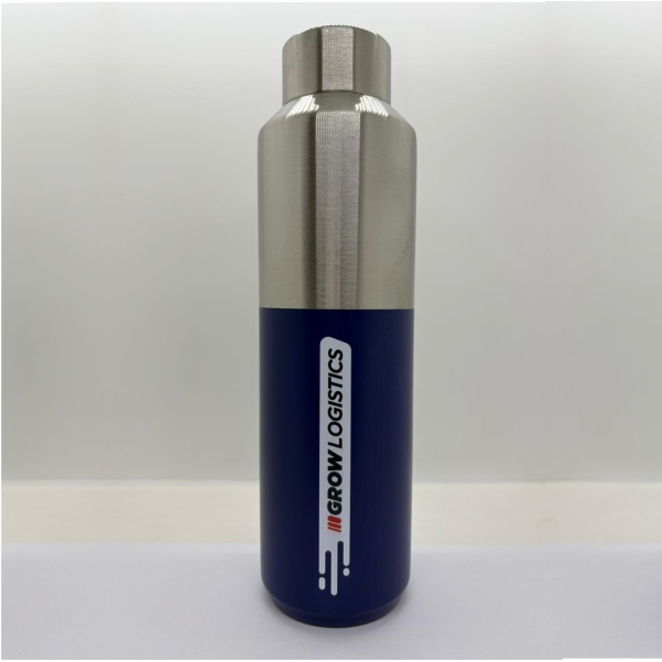Botella doble pared, sellada al vacío.  Interior de acero 304 y exterior de acero 201. Tapa a rosca de acero 201 con anillo de silicona. Pintura acabado mate en parte inferior.