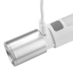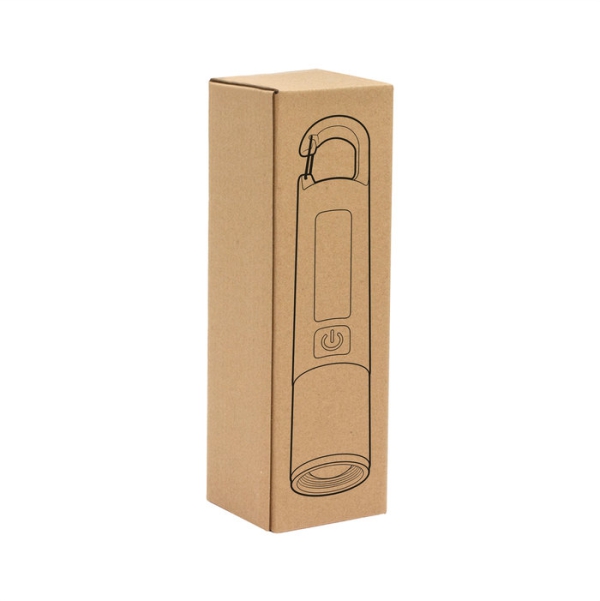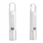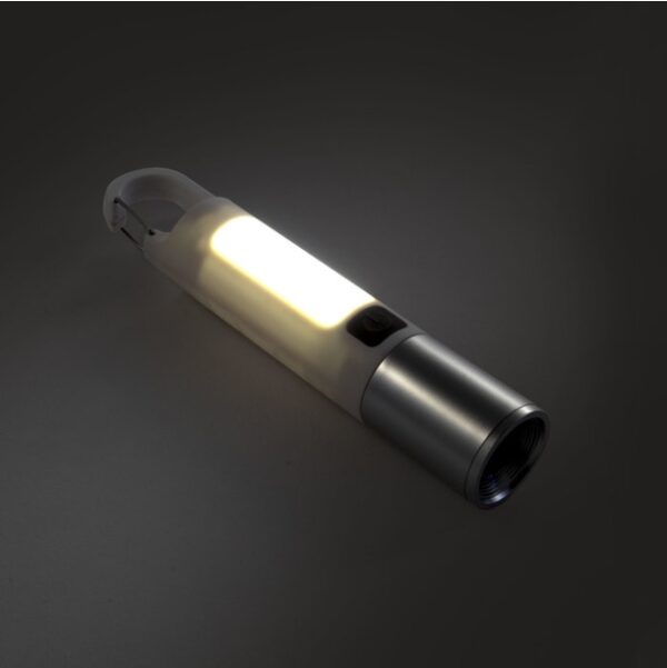 Linterna portátil recargable. Con mosquetón incorporado. Luz de emergencia y 2 intensidades de iluminación (alta e intermitente). Batería recargable 800 mAh. Fuente de luz 7 leds de alta potencia. Puerto USB-C oculto (se desplaza el cuerpo hacia arriba). Cable de carga color blanco.