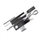 Hecha en ABS/cellidor, con 13 funciones. Herramientas que contiene: Hoja pequeña / Destornillador 3 mm / Destornillador 5 mm / Tijeras / Destornillador Phillips 00/0 / Destornillador Phillips 1/2 / Lupa / Regla (cm) / Regla (pulgadas) / luz LED / Alfiler / Pinzas / Bolígrafo de presión / Hoja de emergencia