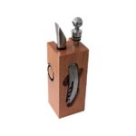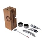 De cinco piezas caladas en bloque de madera. Posee destapador, dos corta gota, pico vertedor, tapón y termómetro. Se entrega en caja de cartón individual.