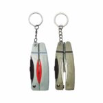 Bolígrafo Plástico y tijera metálica multifunción. Desplegable con linterna y bolígrafo incorporados. Posee aro llavero.