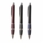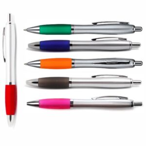 Bolígrafo retráctil plástico de colores con aros plateados en el grip.