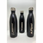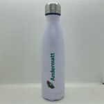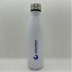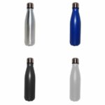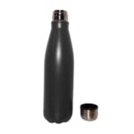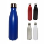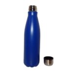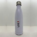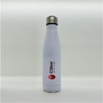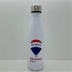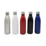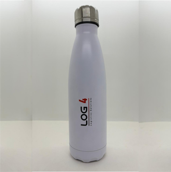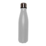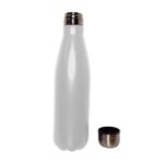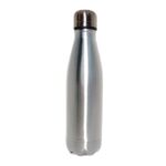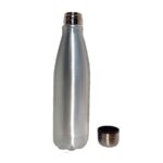 Con pared simple de acero. Tapa a rosca con cierre hermético plástico con aro interno de silicona. Caja contenedora de cartón blanco.
