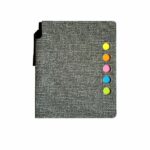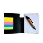 Libreta de cartón recubierto de PVC con bolígrafo inserto, block blanco adhesivo de 50 hojas y señaladores adhesivos.