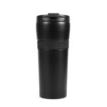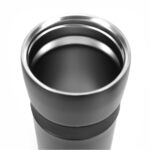 De doble pared en acero inoxidable. Cuenta con terminación exterior en color negro mate. Posee grip de silicona antideslizamiento y Cierre hermético, boca para tomar con traba a presión y silicona para evitar derrames. Producto aprobado por el I.N.A.L. para el contacto con alimentos. Producto libre de BPA.