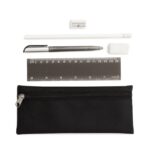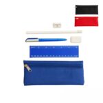 Cartuchera de tela con cierre. Incluye: Bolígrafo, Lápiz grafito, regla, goma y sacapuntas.